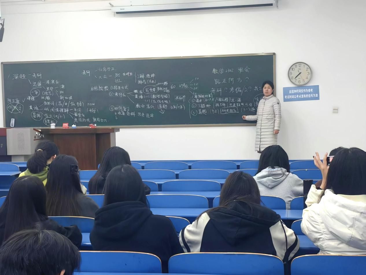 数学与应用数学2302班召开 “路在何方” 主题班会。班主任卫丹老师围绕考研、考公、考编及直接就业四大核心方向,为同学们带来系统性、实用性兼具的职业规划指导,为成长发展注入清晰动能。
