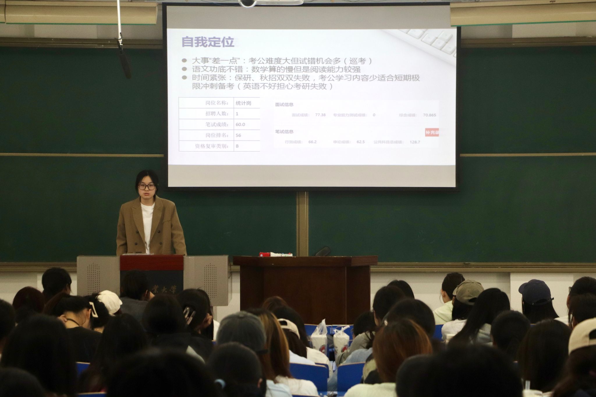 在分享环节,成功推免至东北大学的胡佳丽同学结合自身经历,向同学们介绍了高效的学习方法、与推免相关的重要时间节点、初试准备与复试准备等内容。她鼓励大家提前联系导师,积极参加夏令营,提前熟悉科研环境。第一志愿上岸首都师范大学的孙小朋同学重点从复习时间管理、参考书目选择、备考技巧等方面进行了分享。他强调一定要根据自身情况和兴趣进行院校专业的选择,并且在选择跨专业时要进行多方面考量。调剂上岸河北工程大学的李悠然同学从院校选择、复习规划、学习方法、心态调整等方面进行了详细分享。她告诉同学们“不盲目复制别人的规律,找到适合自己的办法全力以赴”。成功考上公务员的陈以萱同学从公务员招考信息的获取、考试内容的范围、备考的方法、考试形式以及面试经验等多个方面进行交流分享。她建议大家要以历年国家公务员考试为风向标,充分利用国家新闻官方网站,学习其新颖全面、逻辑清晰的论证过程和行文技巧,并保持对于时事政治的敏感度,提升自己的政治素养。