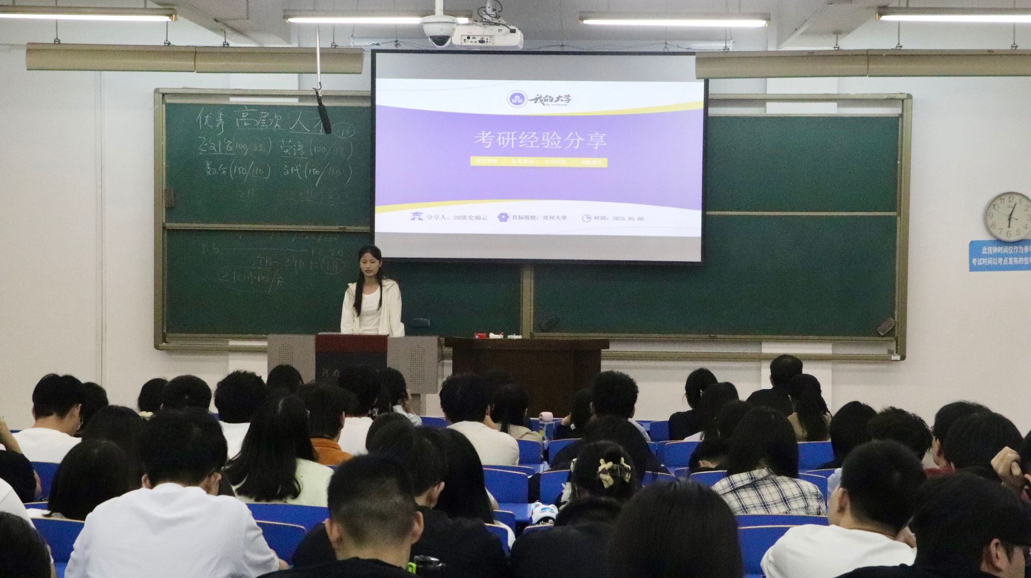 在交流分享环节,考取郑州大学硕士研究生的24届优秀毕业生代表史灿云结合自身考研经历为学弟学妹作了考研经验分享和交流。