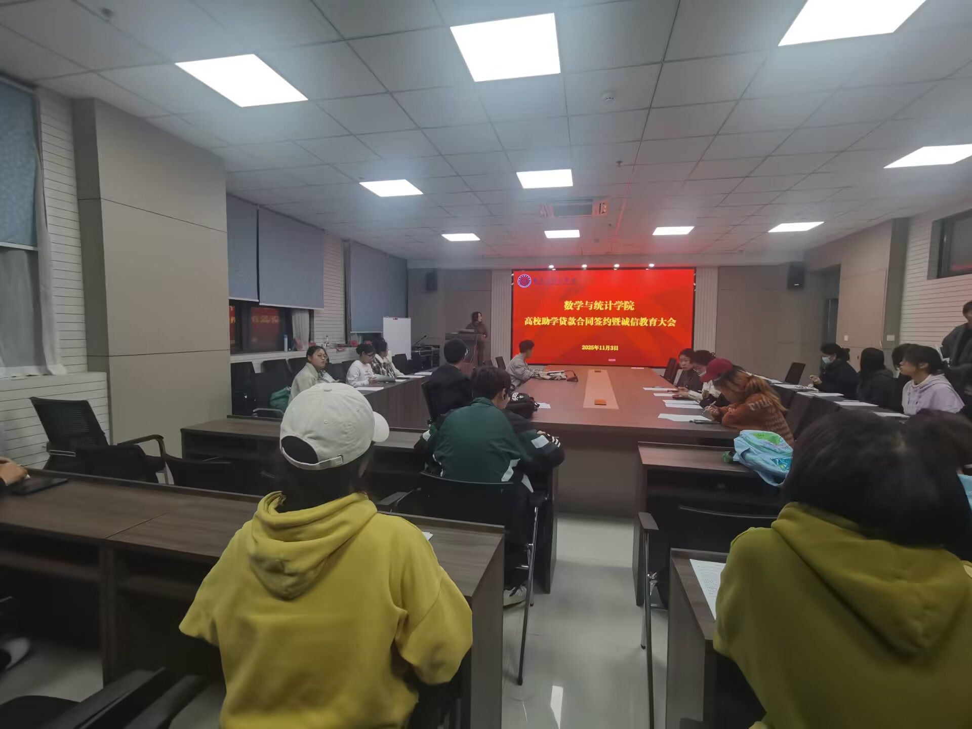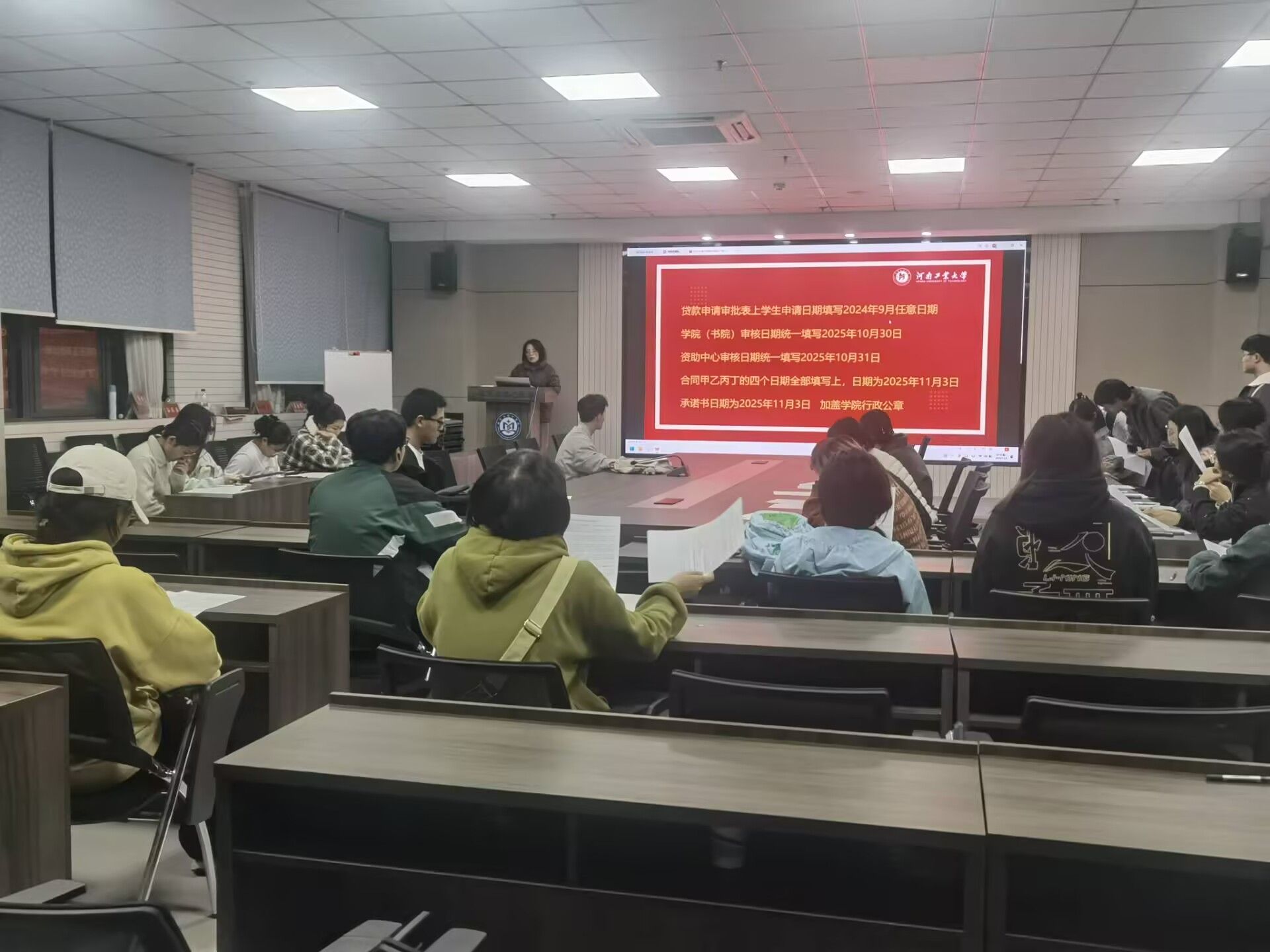 为保障我院2025年国家助学贷款工作有序开展,推动资助工作顺利进行,强化学生诚信教育,11月3日晚,糖心vlog 在惟德楼315会议室召开国家助学贷款合同签约暨诚信教育大会。学院资助负责老师赵洁、资助助理以及申请2025年国家助学贷款的学生参加会议。