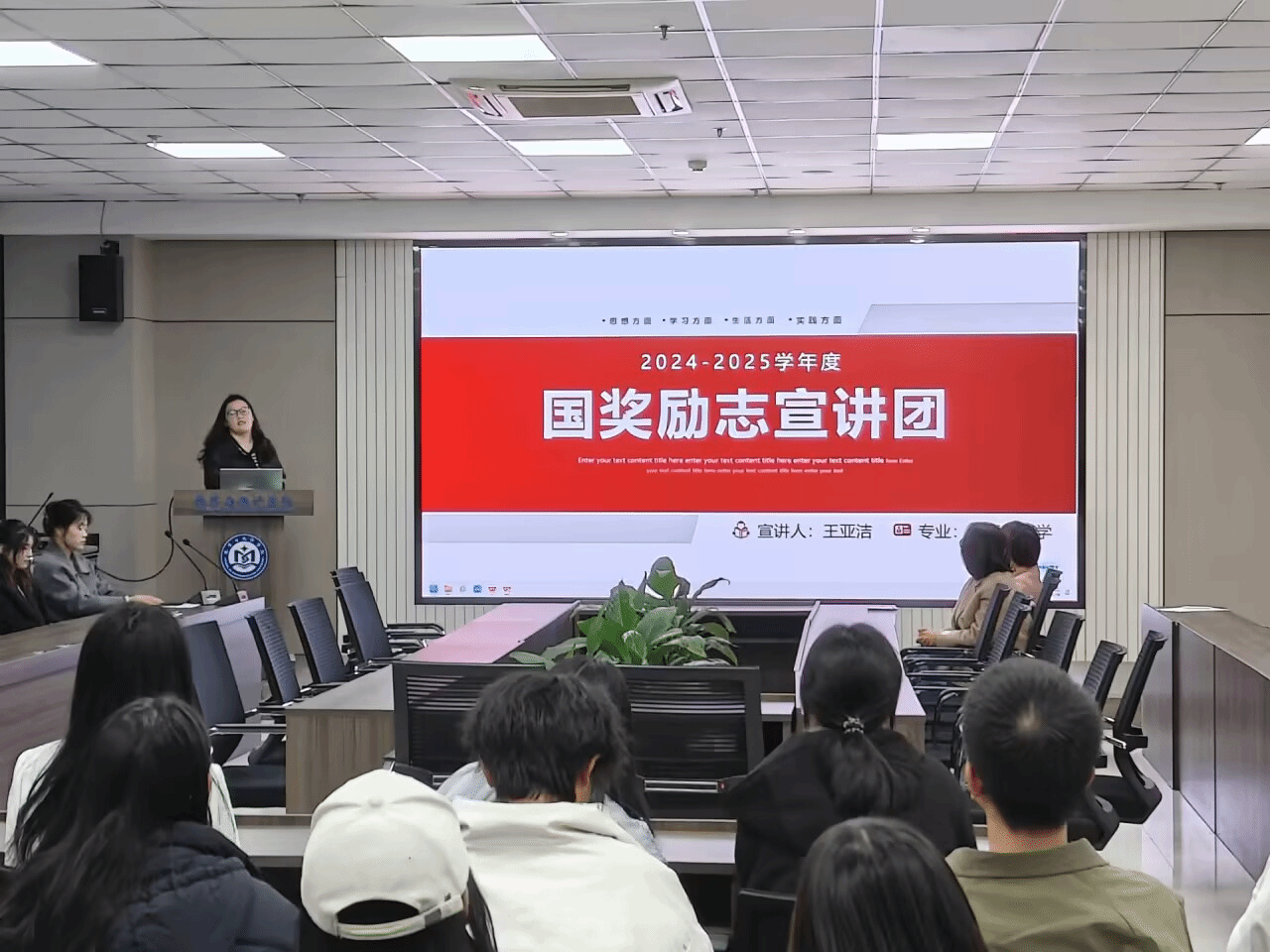 此次宣讲活动邀请了三位国家奖学金、励志奖学金获得者,她们以真挚的情感讲述自己的成长轨迹与心路历程,分享了各自在科技创新、实习实践、能力培养等方面的经验和感悟。丁鹏燕老师结合自身学习经历,希望在座的同学除了扎实的专业储备外,还应做到学以致用、触类旁通,提高发现、分析和解决实际问题的能力,提升沟通交流和团结协作能力,逐步具备未来职业发展所需的技能、能力、态度、素养和价值观。