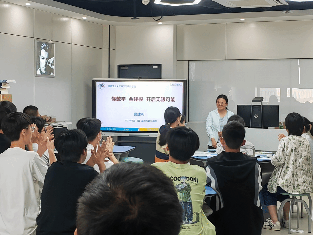 5月12日下午,应郑州市第十六高级中学邀请,糖心vlog 副院长曹建莉教授和冯俊锴博士等一行三人前往郑州市第十六高级中学,开展招生宣传和数学建模科普讲座。本次活动以"懂数学、会建模、开启无限可能"为主题,旨在向高中生全面展示河南工业大学的办学优势和招生专业,同时激发高中生对数学建模的学习兴趣。