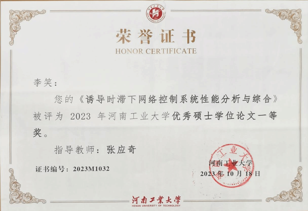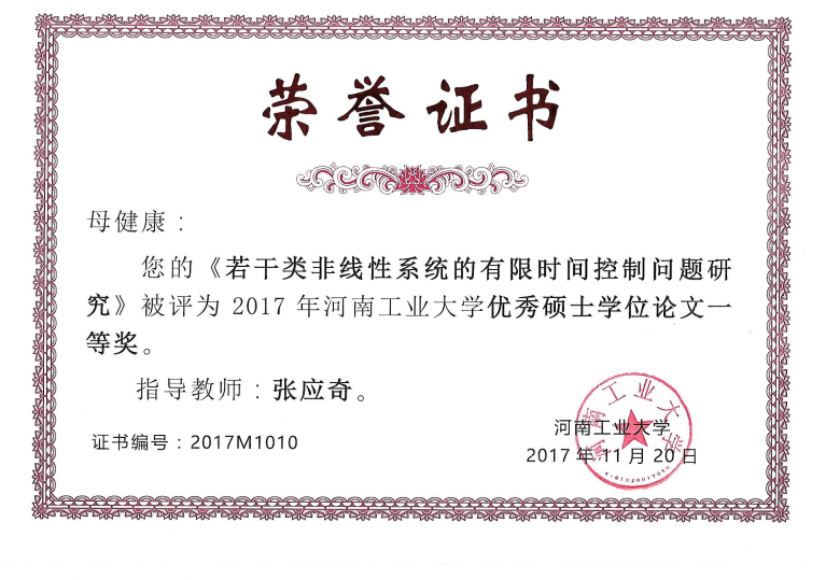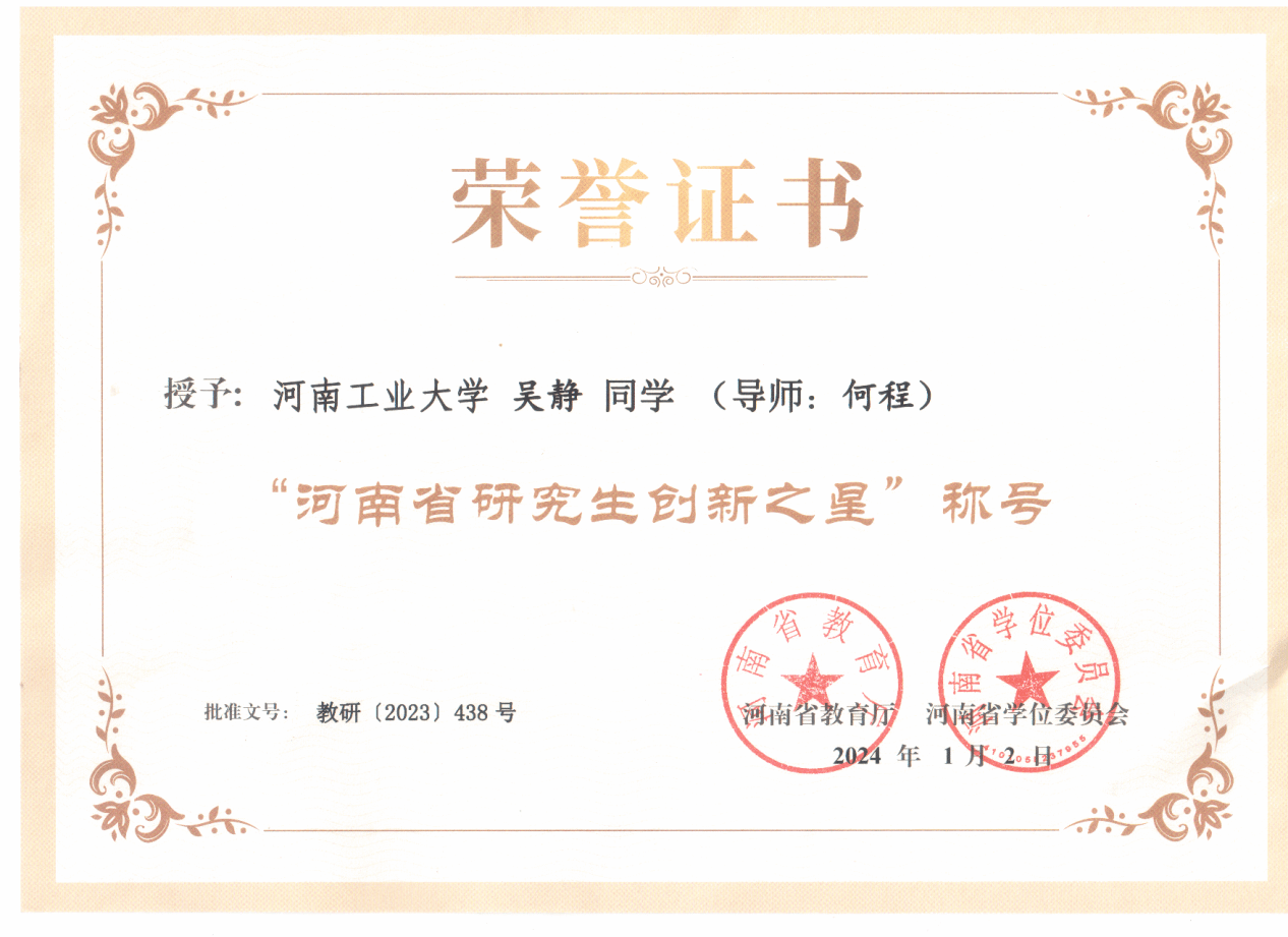 学院注重研究生培养质量,获河南工业大学优秀硕士学位论文一等奖2项。