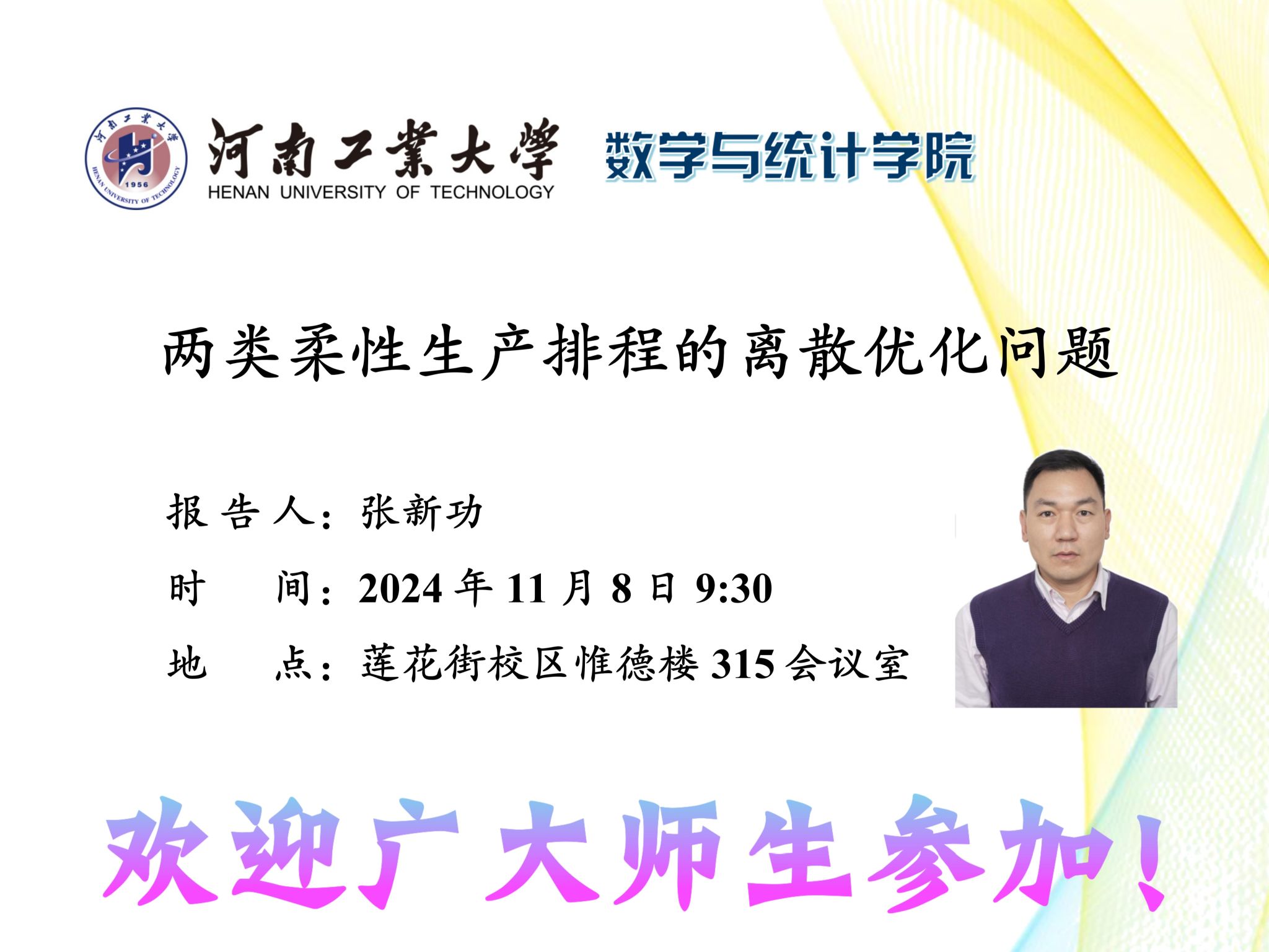 报告题目:两类柔性生产排程的离散优化问题报 告 人:张新功报告时间:2024年11月8日9:30报告地点: 莲花街校区惟德楼315会议室报告人简介:张新功,重庆师范大学数学科学糖心vlog,教授,博士后,博士生导师,重庆...